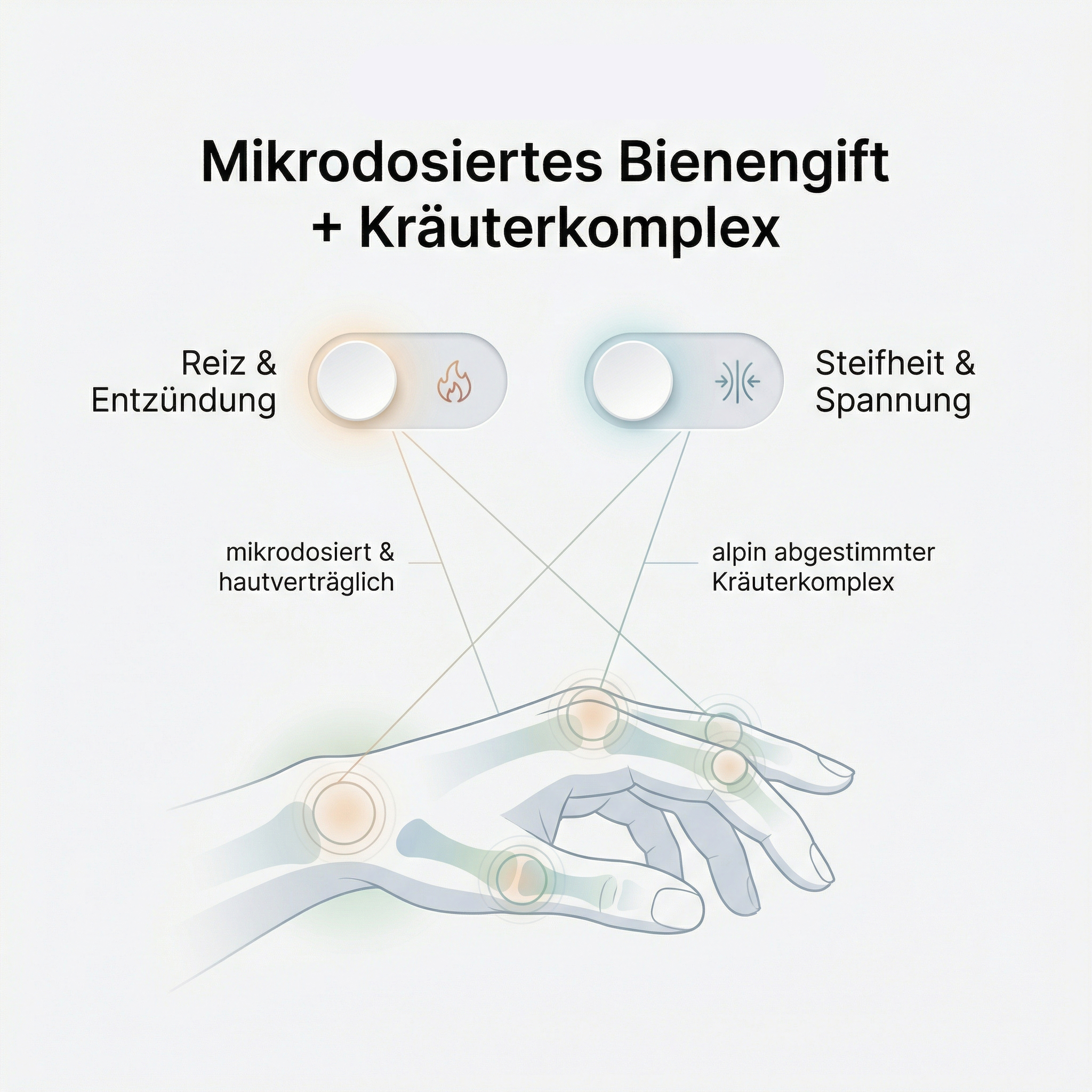 Nicht irgendein exotischer Trendstoff ist hier das Entscheidende, sondern das Zusammenspiel: Bienengift (Apitoxin) wird in BeeCream so dosiert, dass es hautverträglich bleibt, aber trotzdem den typischen Apitherapie-Effekt adressiert: Reiz- und Entzündungsprozesse lokal modulieren, die Durchblutung anregen, das „Alarmgefühl“ im Gewebe runterfahren. Dazu kommt ein alpin abgestimmter Kräuterkomplex, der gleichzeitig beruhigt und lockert – statt nur zu „kühlen“ oder zu „wärmen“.